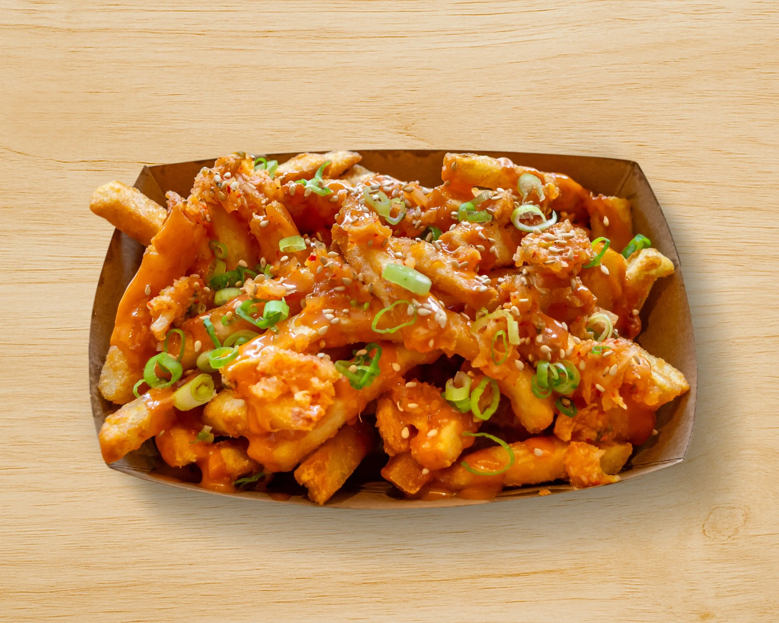 Crispy Fries Topped With Bibim Mayo, Chopped Kimchi, Scallions, Sesame Seeds