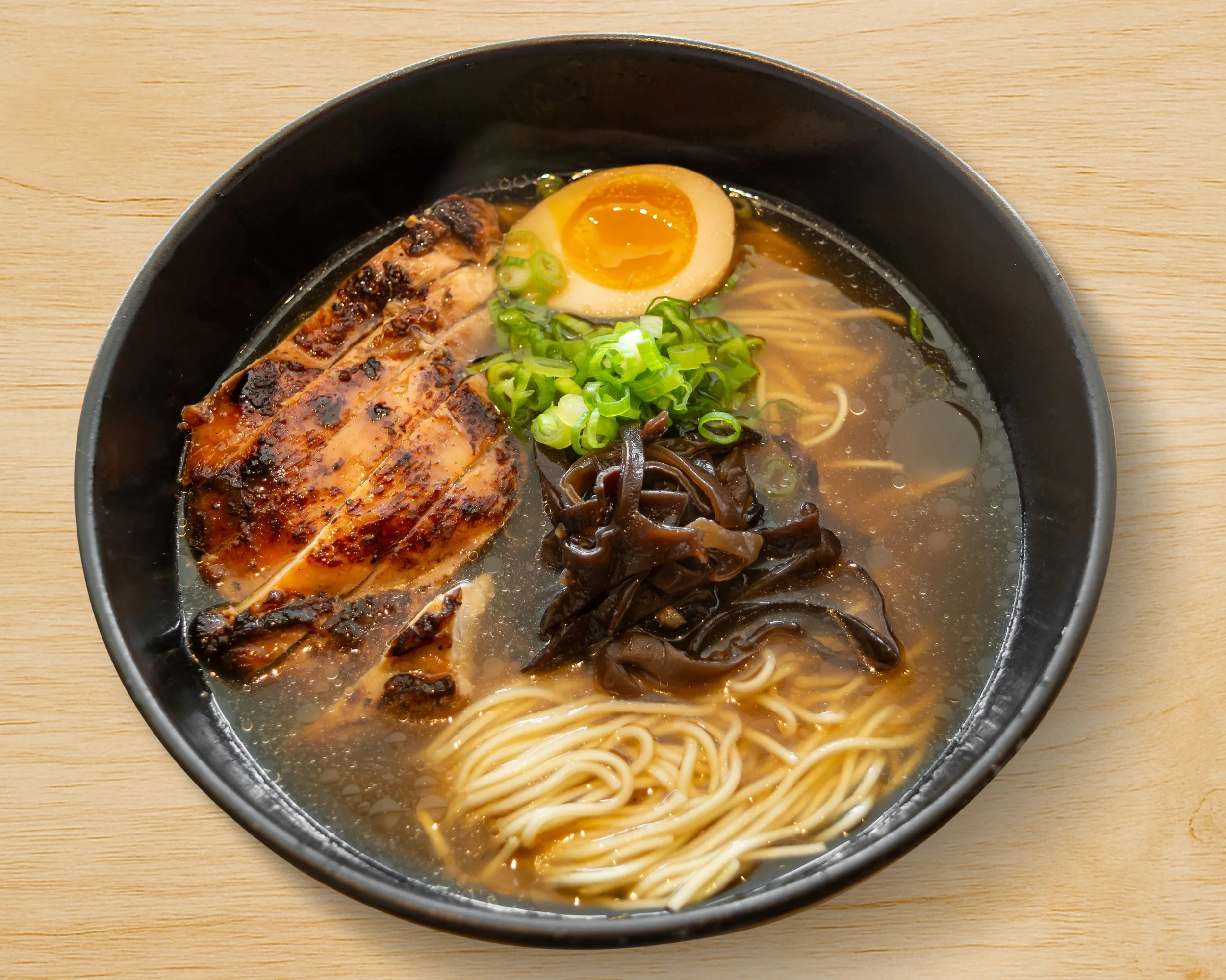 Soy-Based Chicken Broth, Sweet-Soy Marinated Chicken Thigh, *Seasoned Soft Boiled Egg, Bamboo Shoots, Scallions, Komi Oil