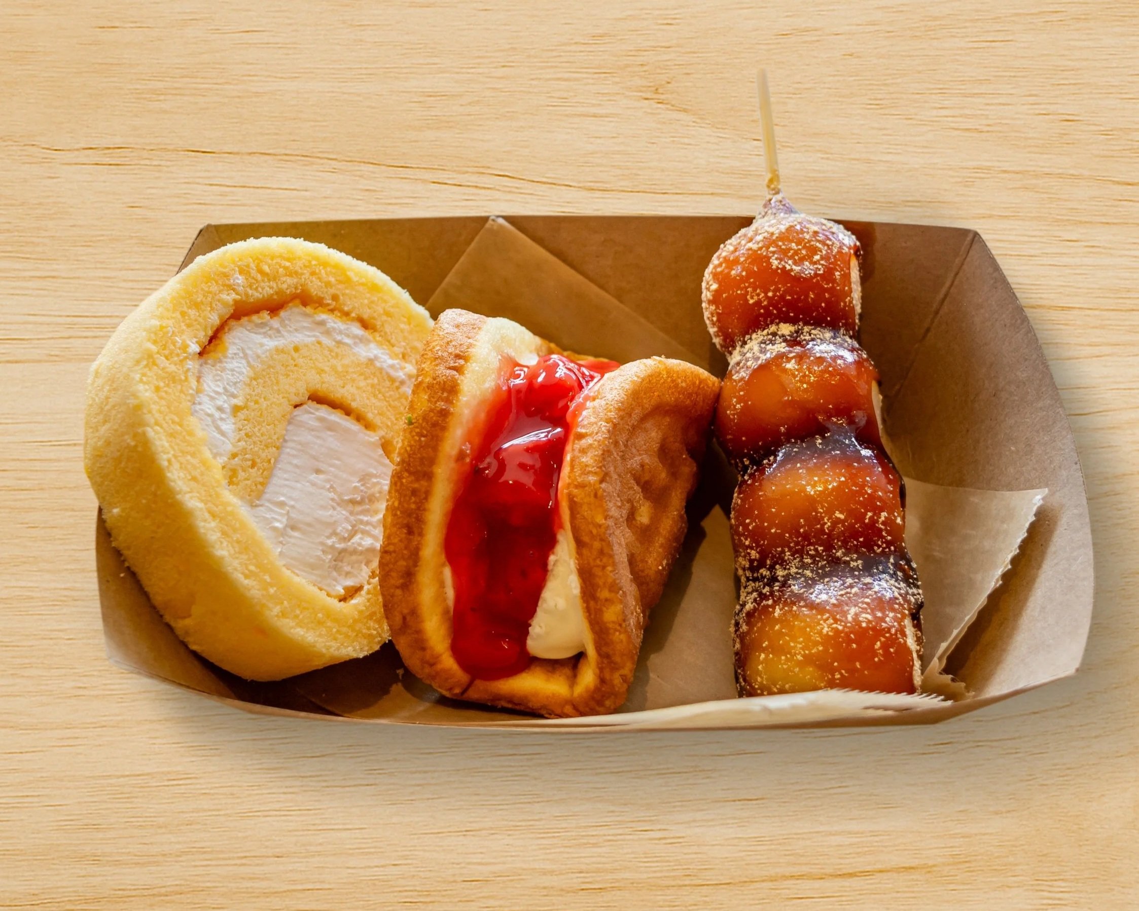 Strawberries And Hokkaido Cream Soft Waffle (Fluffy Taco Shell Filled With Rich Vanilla Cream, Topped With Strawberry Preserves) // Orange & Milk Cream Swiss Roll Cake // Mitarashi Dango (Japanese Rice Flour Dumplings Dipped In A Sweet Soy Glaze Dusted With Roasted Soy Bean Flour)