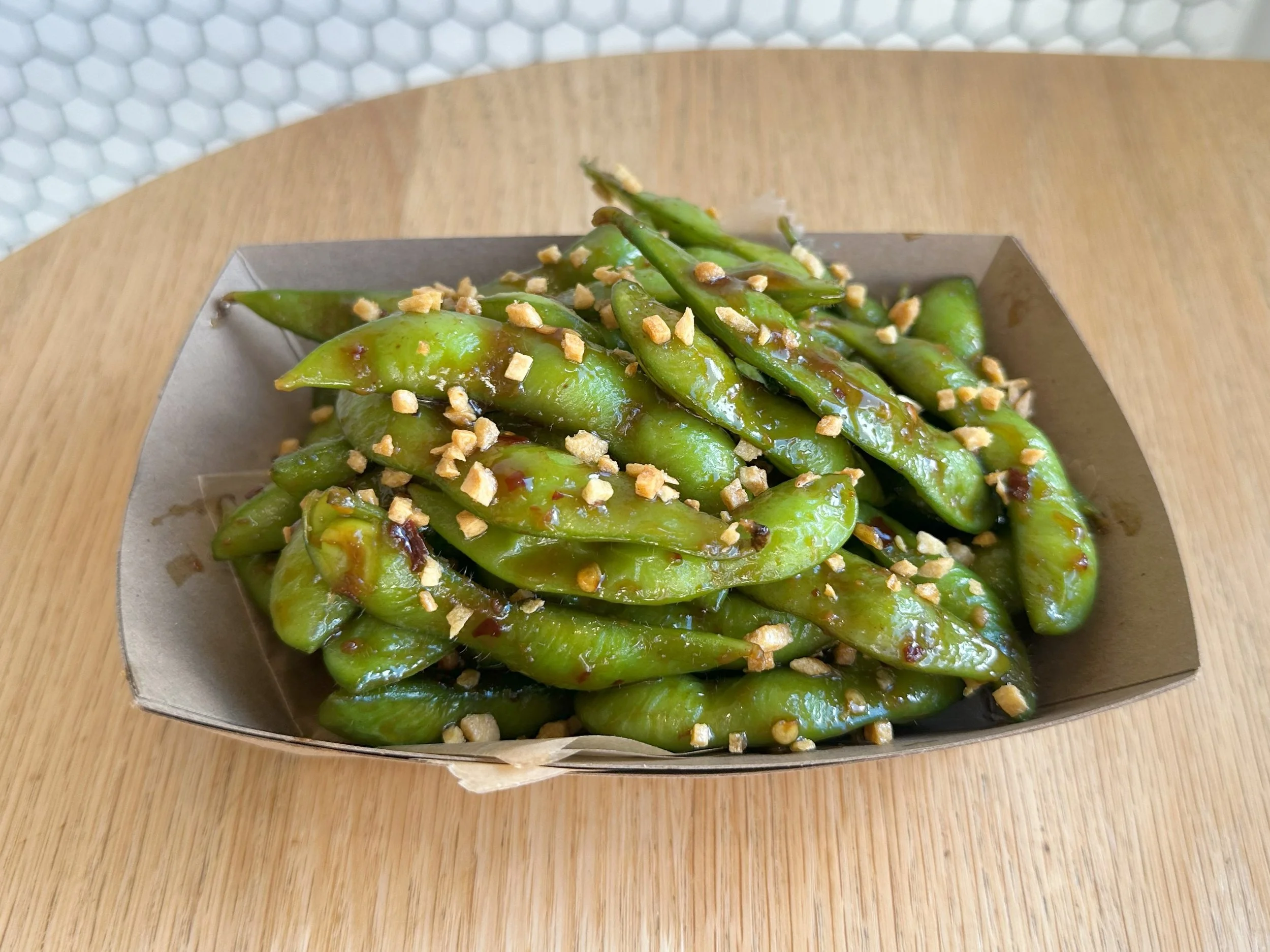 Steamed Edamame W/ Sweet Chili Soy Glaze, Topped With Fried Garlic