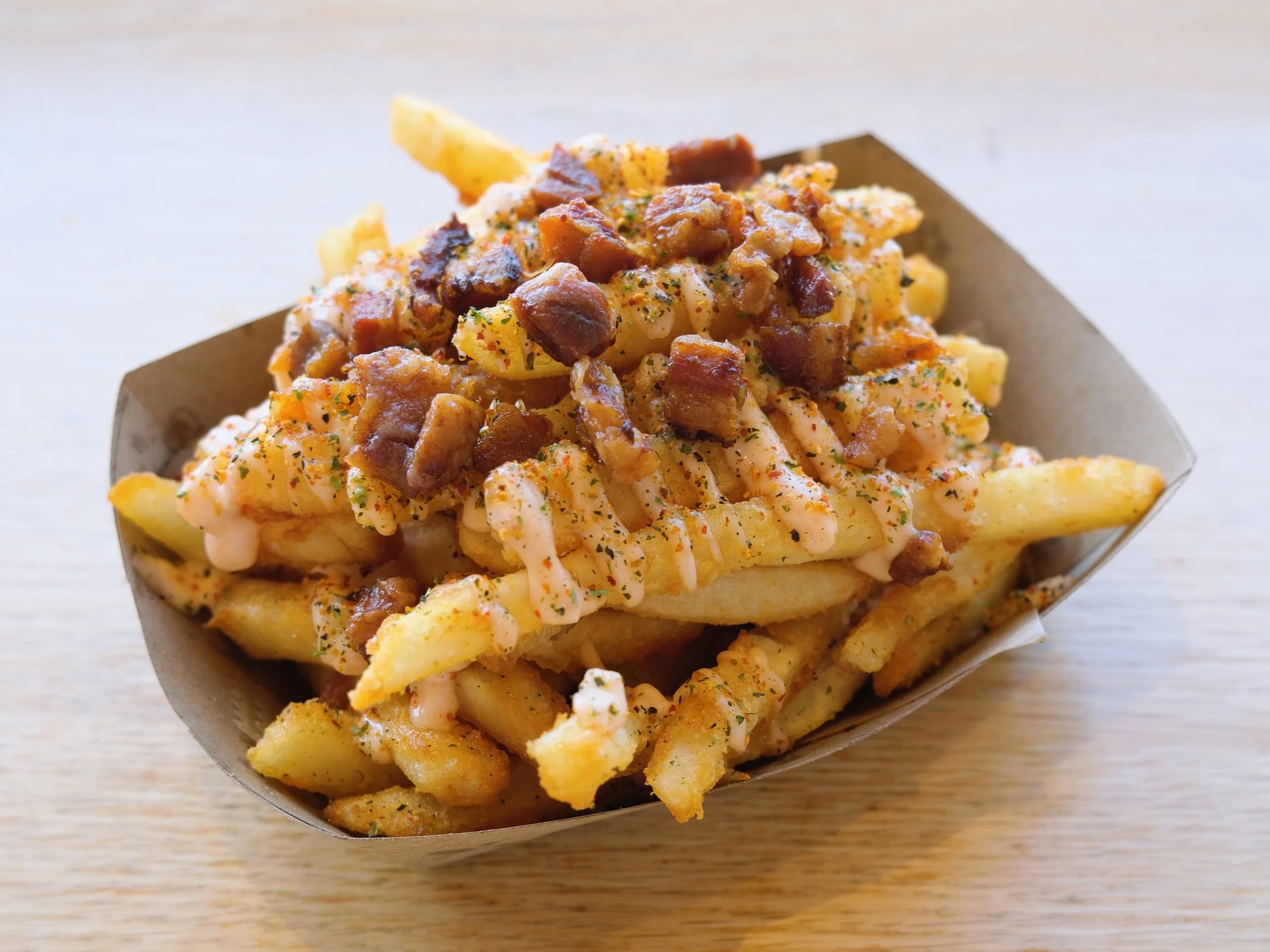 Crispy Fries Topped With Mentaiko Mayo, Chibi House Furikake, & Cheshire Bacon Bit Topping (contains sesame seeds)